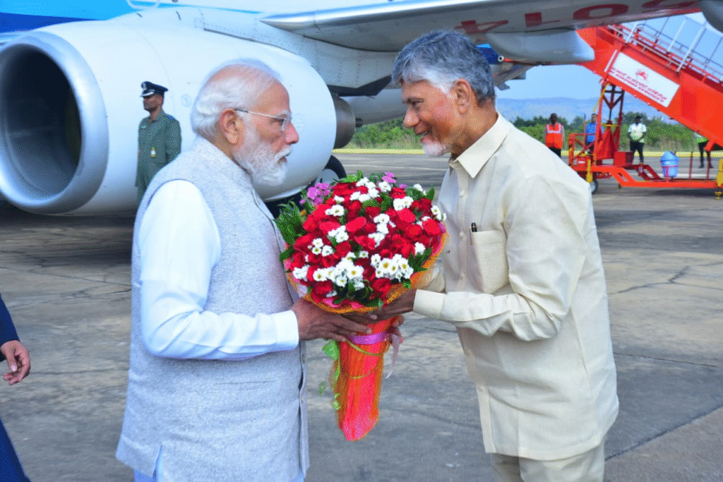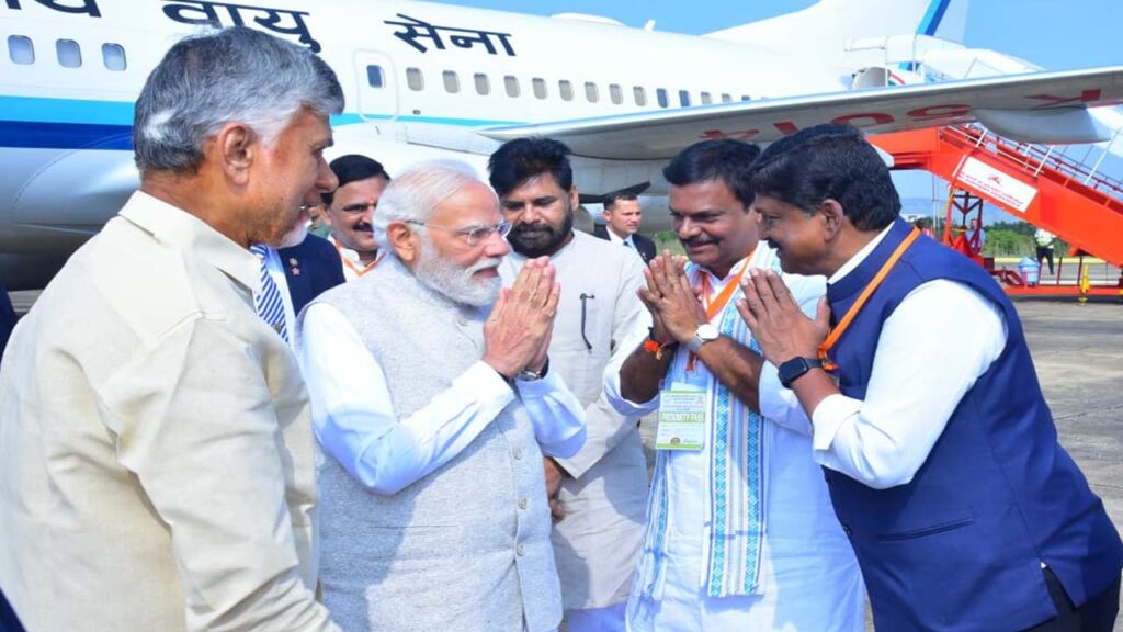 పుట్టపర్తి విమానాశ్రయం వద్ద ప్రధానమంత్రి(Narendra Modi) కి రాష్ట్ర ముఖ్యమంత్రి నారా చంద్రబాబు నాయుడు, ఉప ముఖ్యమంత్రి పవన్ కళ్యాణ్ ఘనంగా స్వాగతం పలికారు. రాష్ట్ర రెవెన్యూ శాఖ, జిల్లా ఇన్చార్జి మంత్రి అనగాని సత్యప్రసాద్, బీసీ సంక్షేమ శాఖ మంత్రి సవితమ్మ, వైద్యారోగ్య శాఖ మంత్రి సత్యకుమార్ యాదవ్, చీఫ్ సెక్రటరీ విజయానంద్, జిల్లా కలెక్టర్ ఏ.శ్యామ్ ప్రసాద్, ఎంపీ బికేపార్థసారథి, ఎమ్మెల్యేలు పల్లె సింధూర రెడ్డి, ఎంఎస్ రాజు, కందికుంట వెంకటప్రసాద్, బండారు శ్రావణి, దగ్గుపాటి ప్రసాద్ తదితర అధికారులు, ప్రజాప్రతినిధులు, నాయకులు మర్యాదపూర్వకంగా కలిసి పుష్పగుచ్చాలు అందజేసి ఘన స్వాగతం పలికారు.