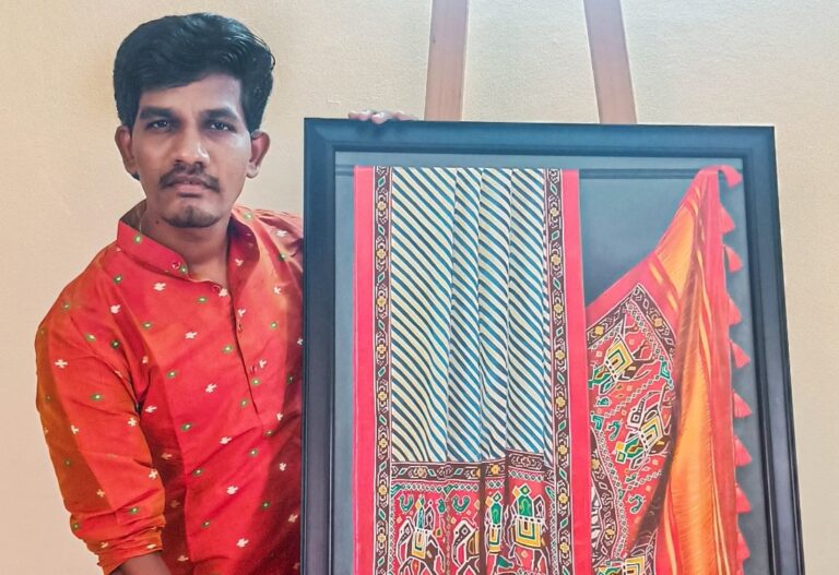 గట్టుప్పల, ఆంధ్రప్రభ: హైదరాబాద్లోని స్టేట్ గ్యాలరీ ఆఫ్ ఆర్ట్ ఆధ్వర్యంలో 2026 నిర్వహించిన అఖిల భారత చిత్రకళా పోటీ, ప్రదర్శనలో మండల కేంద్రానికి చెందిన గంజి రాఘవేంద్ర జాతీయ స్థాయి చిత్రకళ పోటీలకు ఎంపికయ్యాడు. ఈ ప్రతిష్టాత్మక ప్రదర్శనలో దేశవ్యాప్తంగా పలువురు కళాకారులు పాల్గొనగా, ఎంపికైన చిత్రాల్లో రఘు రూపొందించిన కళాకృతి ప్రత్యేక ఆకర్షణగా నిలిచింది. పోచంపల్లి చేనేత చీరను సహజంగా వేలాడదీసినట్లుగా అద్భుతమైన రియాలిస్టిక్ శైలిలో చిత్రించిన ఈ కళాఖండం న్యాయనిర్ణేతలను ఆకట్టుకుంది.