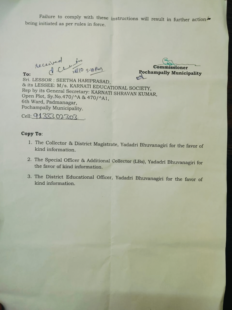 పాఠశాల సమయాల్లో నిర్మాణాలు చేపట్టవద్దని నోటీసులు జారీ చేశారు. నోటీసులను అతిక్రమిస్తే చట్టపరమైన చర్యలు తీసుకుంటామని యాజమాన్యాన్ని హెచ్చరించారు. అనంతరం తహసిల్దారు శ్రీనివాస్ రెడ్డి(Srinivas Reddy) తన సిబ్బందితో కలిసి పాఠశాలను పర్యవేక్షించి పరిశీలించారు. పాఠశాల యాజమాన్యం నిబంధనలు విస్మరిస్తే చట్టపరమైన చర్యలకు వెనుకాడేది లేదని యాజమాన్యానికి తెలిపారు.
