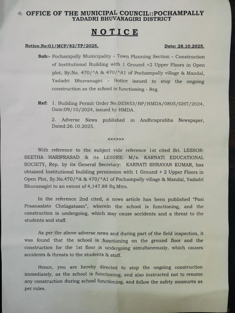 ప్రతినిధి /యాదాద్రి, ఆంధ్రప్రభ : యాదాద్రి భువనగిరి జిల్లాలోని భూదాన్ పోచంపల్లి(Bhoodan Pochampally) పట్టణ కేంద్రంలోని లీడల్ స్కూల్ పై ఈనెల 26న ప్రచురితమైన పసి ప్రాణాలతో చెలగాటం అనే శీర్షిక ఆంధ్రప్రభలో వచ్చిన కథనానికి అధికారులు స్పందించారు. ఈ రోజు ఉదయం మున్సిపల్ కమిషనర్ అంజన్ రెడ్డి(Anjan Reddy) తన సిబ్బందితో కలిసి పాఠశాలను సందర్శించారు.