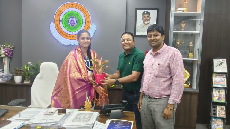 విజయవాడ, ఆంధ్రప్రభ : విజయవాడలో ఆంధ్రప్రదేశ్ స్క్యూలింగ్ అండ్ రౌయింగ్ అసోసియేషన్ అఫ్ ఆంధ్ర ప్రదేశ్ అధ్యక్షుడు డా. తరుణ్ కాకాని, రౌయింగ్ ఫెడరేషన్ అఫ్ ఇండియా అధ్యక్షుడు బాలాజీ మారడపాతో కలిసి స్పోర్ట్స్ అథారిటీ అఫ్ ఆంధ్ర ప్రదేశ్ మేనేజింగ్ డైరెక్టర్ శ్రీ ఎస్. భారణి ను కలిశారు.