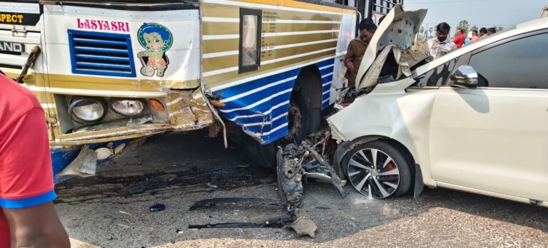 మోపిదేవి, ఆంధ్రప్రభ : జాతీయ రహదారిపై శుక్రవారం ఉదయం రోడ్డు ప్రమాదం జరిగింది. ఈ ప్రమాదంలో ఎవరికీ ఎలాంటి గాయాలు కాకపోవడంతో ప్రజలు ఊపిరి పీల్చుకున్నారు. విజయవాడ వైపు వెళ్తున్న ఆర్టీసీ బస్సును ఇన్నోవా కారు అతివేగంగా ఢీకొట్టడంతో ముందు భాగం పూర్తిగా దెబ్బతింది. జాతీయ రహదారిపై ఇటీవల ప్రమాదాలు జరుగుతున్నాయి. అధికారులు ఎన్ని హెచ్చరికలు చేసినప్పటికీ మితిమీరిన వేగంతో డ్రైవింగ్ చేయడం మాత్రం వాహనదారులు మానుకోవడం లేదు. బస్సు ముందు చక్రం భాగం పార్టీ డ్యామేజ్ జరిగింది. స్థానికులు పోలీసులకు సమాచారం ఇచ్చారు.