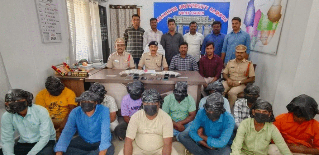 హన్మకొండ చింతగట్టుకు చెందిన గర్నపల్లి.అరవింద్ (35),ముప్పారపు రాజేంద్రప్రసాద్ (44), పడమరకోటకు చెందిన చిట్ల రాజేష్ (24), దేవర వినయ్ (36), జెట్టబోయిన కుమార్ (34),జనగామ జిల్లా చిల్పూర్ మండలం శ్రీపతిపల్లికి చెందిన వంగ శివకుమార్ (25),బాషాబోయిన శ్రీకాంత్ (24),ఈర్ల విఘ్నేష్ (25), స్టేషన్ ఘన్ పూర్ మండలం కొత్తపల్లికి చెందిన గంగుల అనిల్ (32), బురు మధుకర్ (34), పింగిల్ల రవీందర్ (35) లను అరెస్ట్ చేశారు. తదుపరి విచారణ కోసమై కేయుసి పోలీసులకు అప్పగించారు.