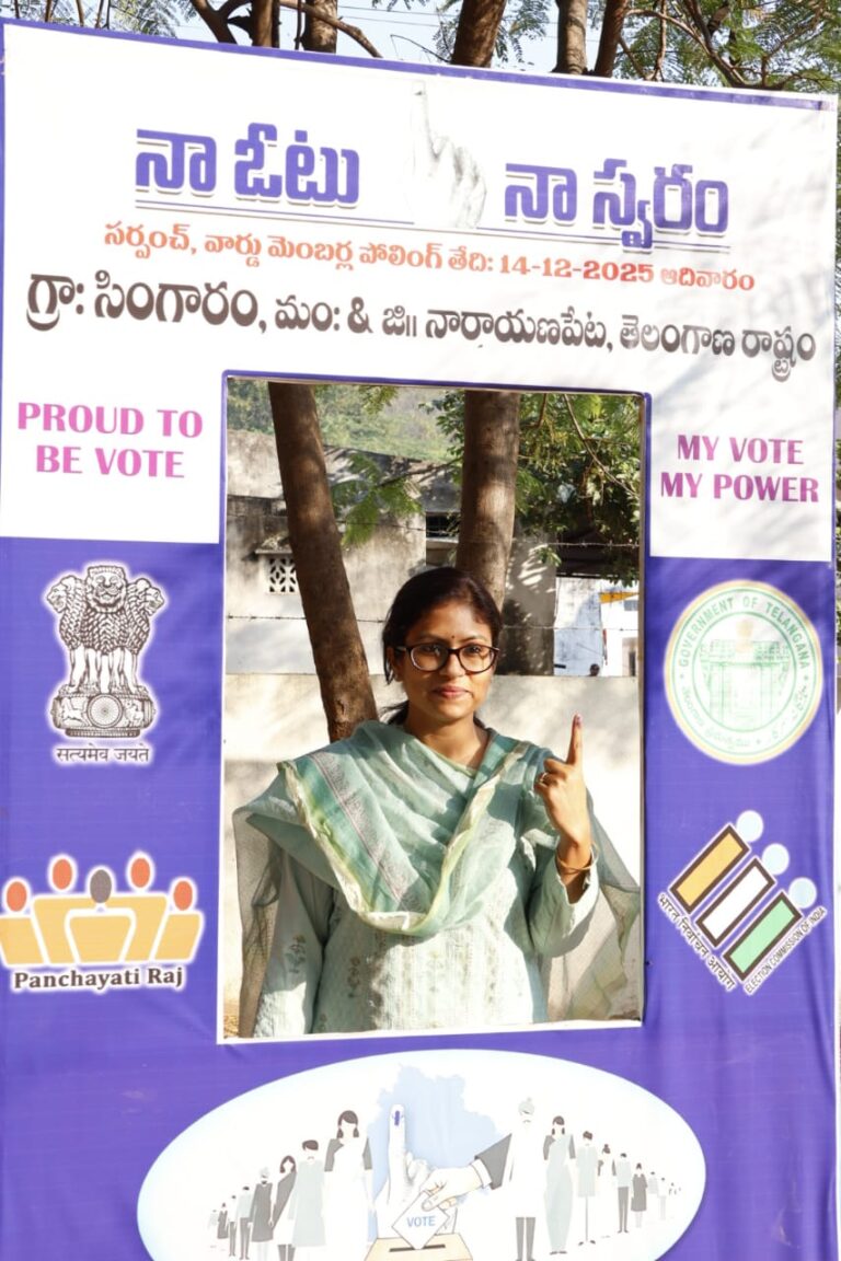 సింగారం గ్రామ మలుపు దారిలో కలెక్టర్ బంగ్లా సింగారం పరిధిలోని కౌరంపల్లి శివారులో ఉండటంతో కలెక్టర్ ఓటు సింగారం గ్రామంలో నమోదైంది. ఈ మేరకు కలెక్టర్ ఆదివారం తన ఓటు హక్కును సింగారం పోలింగ్ కేంద్రంలో వినియోగించుకున్నారు. రెండో విడతలో దామర గిద్ద, నారాయణ పేట, ధన్వాడ, మరికల్ మండలాల పరిధిలోని గ్రామాలలో ఎన్నికల పోలింగ్ జరుగుతోందని, జిల్లా కలెక్టరేట్ నుంచి వెబ్ క్యాస్టింగ్ ద్వారా తాము పోలింగ్ సరళిని పర్యవేక్షిస్తున్నామని, అంతటా ప్రశాంతంగా పోలింగ్ కొనసాగుతుందని ఆమె పేర్కొన్నారు. తాను కూడా ఇక్కడి సింగారం గ్రామంలోని పదో వార్డు పోలింగ్ బూత్ లో ఓటు హక్కును వినియోగించుకోవడం జరిగిందని మీడియాకు తెలిపారు.