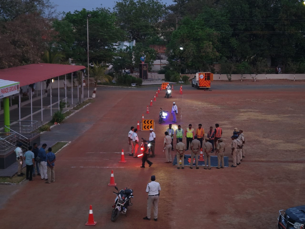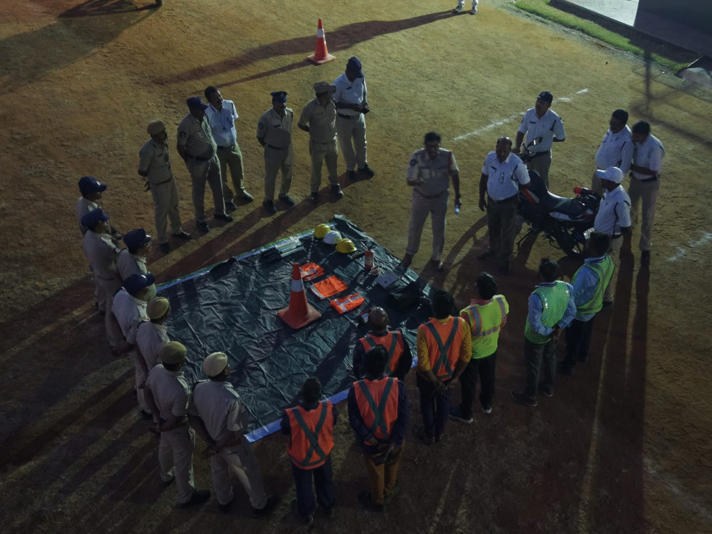 అలాగే రోడ్డు భద్రత వాహనాల్లో తప్పనిసరిగా ఉండాల్సిన పరికరాలను ప్రదర్శించారు. ప్రమాద స్థలంలో వాహనం వెనుక 150 అడుగుల దూరంలో, సమీపంలో, ముందు భాగంలో హెచ్చరిక కోన్లు అమర్చడం, 100 అడుగుల దూరం వరకు టేపరింగ్ విధానంలో ఏర్పాటు చేయడం, తగిన దూరంలో కోన్ల మధ్య విరామం పాటించడం వంటి అంశాలను వివరించారు.