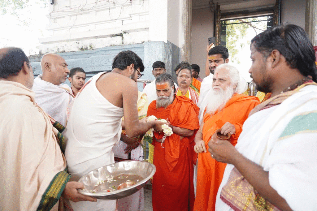 స్వామీజీ ఆలయ ప్రాంగణంలోకి చేరుకోగానే ఆలయ అర్చకులు, అధికారులు వేద మంత్రోచ్ఛారణల మధ్య స్వస్తి వచనాలతో ఘన స్వాగతం పలికారు. శ్రీ స్వామి వారి దర్శనం అనంతరం కల్యాణ మండపంలో స్వామీజీకి రాజన్న శేష వస్త్రం(Sesha Vastra), లడ్డూ ప్రసాదాన్ని ఆలయ అధికారులు మహారాజ్ కు అందజేసి ఘనంగా సత్కరించారు. ఈ కార్యక్రమంలో ప్రోటోకాల్ సహాయ కార్యనిర్వహణాధికారి జి.అశోక్ కుమార్(G. Ashok Kumar), ఆలయ పర్యవేక్షకులు రాజేందర్ , ఆలయ అర్చకులు వేద పండితులు ఉన్నారు.