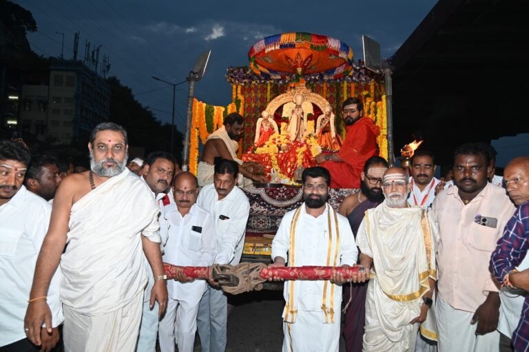 ఎన్టీఆర్ జిల్లా బ్యూరో (ఆంధ్రప్రభ) : పౌర్ణమి సమయాన ఆదిదంపతులు భక్త జనాలకు కనువిందు చేస్తూ అనుగ్రహిస్తూ పురవీధుల్లో విహరించారు. విజయవాడలోని ఇంద్రకీలాద్రి పై ఉన్న శ్రీ దుర్గా మల్లేశ్వర స్వామి వార్ల దేవస్థానం ఆధ్వర్యంలో ఇంద్రకీలాద్రి గిరిప్రదక్షిణ అత్యంత వైభవంగా శోభాయమానంగా కొనసాగింది. ఇంద్రకీలాద్రి పై కొలువుదీరిన కనకదుర్గ అమ్మవారి పౌర్ణమి గిరి ప్రదక్షిణ కార్తీక పౌర్ణమి బుధవారం వేకువజామున అత్యంత వైభవంగా జరిగింది. అమ్మవారి గిరి ప్రదక్షిణ ప్రారంభానికి ముందు ఆలయ కార్యనిర్వహణాధికారి వి.కె. శీనానాయక్ ప్రత్యేక పూజలు నిర్వహించి, దృష్టి దోష నివారణకు గుమ్మడికాయను కొట్టారు. ఆలయ స్థానాచార్యులు శివ ప్రసాద్ శర్మ, ముఖ్య అతిథులు శ్రీనివాస్ శాస్త్రి తో కలసి భక్తులతో శ్రీ అమ్మవారి గిరిప్రదక్షిణకు పాదయాత్రగా ముందుకు సాగారు.