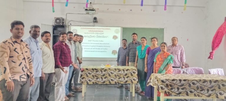 ఉరవకొండ రూరల్, ఆంధ్రప్రభ : ఆంధ్రప్రదేశ్ రాష్ట్ర రాజధానిగా అమరావతిని పార్లమెంట్ లో ఆమోదం పొంది చట్టంగా రూపాంతరం చెందిన సందర్భంగా గురువారం మండలంలోని చిన్న ముష్టూర్ లోని ప్రభుత్వ పాలిటెక్నిక్ కళాశాల లోని విద్యార్థులు సంబరాలు చేసుకున్నారు. జై అమరావతి అంటూ పెద్ద ఎత్తున నినాదాలు చేశారు.