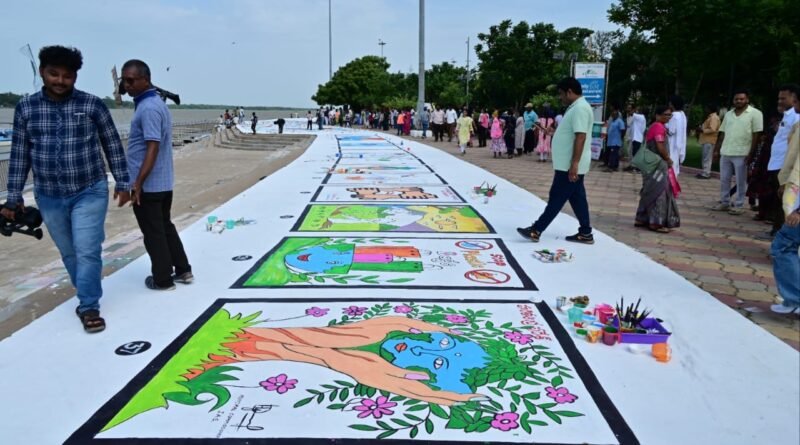 Floor Painting | కృష్ణమ్మ తీరంలో కుంచెతో కోటి భావాలు ఎన్టీఆర్ బ్యూరో ఆంధ్రప్రభ, జిల్లా అధికార యంత్రాంగం, విజయవాడ నగరపాలక సంస్థ (vmc)
