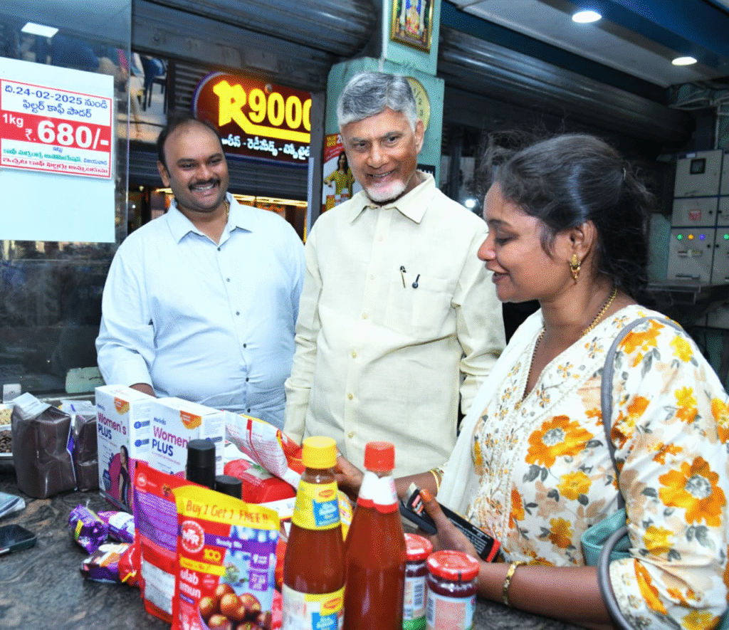 ఆ తర్వాత కిరాణా షాపు నిర్వాహకుడు బొడ్డు శ్రీనివాస్‌తో నిత్యావసర వస్తువుల ధరలు, జీఎస్టీ తగ్గింపు తర్వాత వచ్చిన మార్పుల గురించి చర్చించారు. ఈ సందర్భంగా బీసెంట్ రోడ్‌లో కొనుగోలుకు వచ్చిన సాధారణ పౌరులతో కూడా చంద్రబాబు మాట్లాడి, వారితో ఫోటోలు దిగారు.
