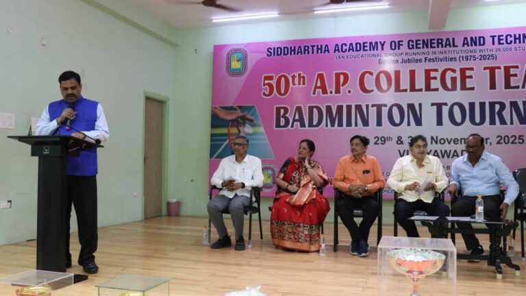 విజయవాడ, ఆంధ్రప్రభ : నగరంలోని సిద్ధార్థ అకాడమీ ఆఫ్ జనరల్ అండ్ టెక్నికల్ ఎడ్యుకేషన్ స్వర్ణోత్సవాల్లో భాగంగా 50వ ఏపీ కాలేజి టీచర్స్ బ్యాడ్మింటన్ టోర్నమెంట్ శనివారం ప్రారంభమయింది. విజయవాడలోని దుర్గా మల్లేశ్వర సిద్ధార్థ మహిళా కళాశాలలో జరిగిన ఈ పోటీల ప్రారంభకార్యక్రమంలో కృష్ణా విశ్వవిద్యాలయం ఉపకులపతి ఆచార్య  కె.రాంజీ, బ్యాడ్మింటన్ అసోసియేషన్ అధ్యక్షులు ఎం.వీరభద్రరావు, సిద్ధార్థ కళాశాలల ప్రిన్సిపాల్స్ డా. మేకా రమేశ్, డా. పద్మజ, రాష్ట్ర క్రీడా ప్రాధికార సంస్థ మాజీ చైర్మన్ అంకమ్మ చౌదరి  తదితరులు పాల్గొన్నారు.