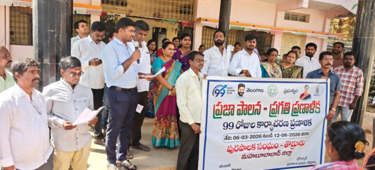 తొర్రూరు, ఆంధ్రప్రభ : తొర్రూరు పట్టణ అభివృద్ధికి ప్రతి ఒక్కరు సహకరించాలని తోరూర్ మున్సిపల్ చైర్మన్ తూనం శ్రావణ్ కుమార్ కోరారు.తెలంగాణ రాష్ట్ర ప్రభుత్వం ప్రతిష్టాత్మకంగా చేపట్టిన ప్రజాపాలన – ప్రగతి ప్రణాళిక కార్యక్రమంలో భాగంగా శుక్రవారం మునిసిపాలిటీ కార్యాలయంలో మున్సిపల్ కమిషనర్ శ్యాంసుందర్ ఆధ్వర్యంలో ప్రజా పాలన ప్రగతి ప్రణాళిక షెడ్యూల్ ప్రకారం మున్సిపాలిటీలోని కౌన్సిలర్లు, మున్సిపల్ సిబ్బందులచే ప్రతిజ్ఞ చేయించి, 10వ వార్డులో పారిశుద్ధ్య కార్యక్రమాలను ప్రారంభించారు. ఈ సందర్భంగా చైర్మన్ శ్రావణ్ కుమార్ మాట్లాడుతూ రాష్ట్ర ప్రభుత్వం 99 రోజుల ప్రజా పాలన-ప్రగతి ప్రణాళిక అనే ప్రత్యేక కార్యక్రమాన్ని చేపట్టడానికి శ్రీకారం చుట్టిందని, దీనిలో భాగంగా మున్సిపాలిటీలో ప్రతి ఒక్కరు సమన్వయంతో పట్టణ అభివృద్ధికి పాటుపడాలన్నారు. అన్ని వార్డులలో పనులు జరిగే విధంగా ప్రజలు, స్వచ్ఛంద సంస్థలు, మహిళా సంఘాలు, యువకులను భాగస్వామ్యం చేయాలని సూచించారు.ఈ కార్యక్రమంలో వైస్ చైర్ పర్సన్ సోమ రజని రాజశేఖర్, కౌన్సిలర్లు తూర్పాటి రవి, మాడుగుల భవానిలత, అల్లం శ్యామల, కిన్నెర కవిత, ముద్దసాని సురేష్, ధరావత్ పద్మ,చకిలేల అలివేణి, జాటోత్ భద్రు నాయక్, మున్సిపల్ సిబ్బంది,మెప్మా, ఆర్పీలు, తదితరులు పాల్గొన్నారు.