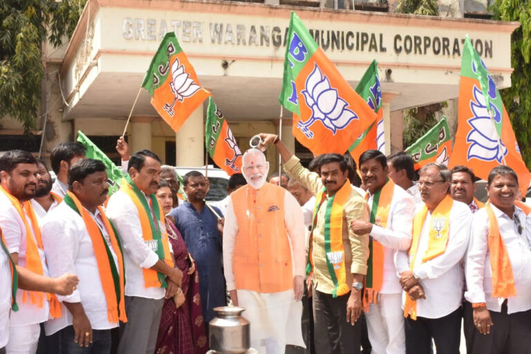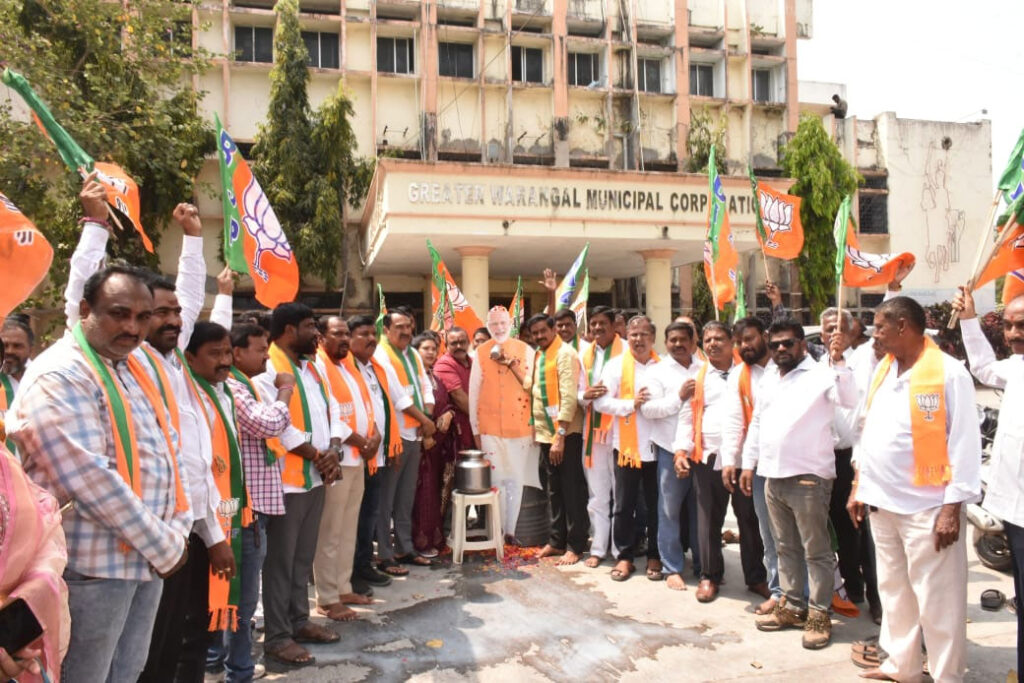 వరంగల్ మునిసిపల్ కార్యాలయం వద్ద ప్రధాని మోదీ చిత్రపటానికి క్షీరాభిషేకం.