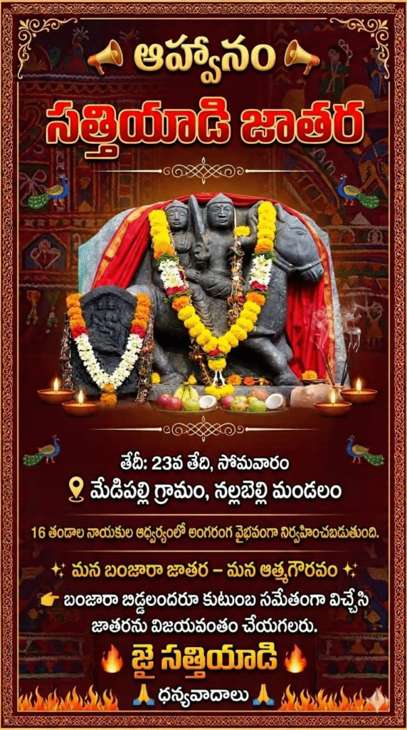 ఈ మహోత్సవాన్ని 16 తండాల గౌరవనీయ నాయకులు, గ్రామ పెద్దలు సమిష్టిగా నిర్వహించడం ప్రత్యేకత. జాతర సందర్భంగా శాస్త్రోక్త పూజలు, బంజారా సంప్రదాయ ఆచారాలు, ప్రత్యేక వేడుకలు నిర్వహించడంతో పాటు భక్తులు కీర్/లాప్సీ (బెల్లం అన్నం) నైవేద్యంగా సమర్పించి, అనంతరం ప్రసాదంగా పంపిణీ చేయనున్నారు. ఈ సందర్భంగా తండాల నాయకులు, గ్రామ పెద్దలు మాట్లాడుతూ. సత్తియాడి దేవతపై లంబాడీ సమాజానికి ఉన్న నమ్మకం అపారమని, తల్లి ఆశీస్సులతో అనేక కుటుంబాలు అభివృద్ధి చెందాయని తెలిపారు. ఈ జాతర మరింత వైభవంగా జరిగేలా ప్రతి ఒక్కరూ పాల్గొని ఐక్యతను చాటాలని పిలుపునిచ్చారు.అదేవిధంగా, జాతరకు భారీగా భక్తులు తరలివచ్చే నేపథ్యంలో మేడపల్లి గ్రామానికి వెళ్లే రహదారులు మరమ్మతులు చేయాలని, గుడి పరిసరాల్లో విద్యుత్ సదుపాయం మెరుగు పరచాలని, తాగునీటి వసతి కల్పించాలని అధికారులను కోరారు.