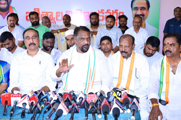 జగిత్యాల ఆంధ్రప్రభ : జగిత్యాల జిల్లా కేంద్రంలో ఈనెల 20వ తేదీన నిర్వహిస్తున్న బీఆర్ఎస్ పార్టీ మీటింగ్ జీవన్ రెడ్డి చేరిక సభనా లేదా బీఆర్ఎస్ పార్టీ బహిరంగ సభనా ప్రకటించాలని రాష్ట్ర సాంఘిక సంక్షేమ శాఖ మంత్రి అడ్లూరి లక్ష్మణ్ కుమార్ డిమాండ్ చేశారు. శనివారం జగిత్యాల జిల్లా కేంద్రంలో మోతే రోడ్ లోని పార్టీ కార్యాలయంలో కాంగ్రెస్ పార్టీ జిల్లా అధ్యక్షుడు నందయ్య, జగిత్యాల ఎమ్మెల్యే డాక్టర్ సంజయ్ కుమార్ ,మున్సిపల్ చైర్మన్ సమిండ్ల వాణితో పాటు పలువురు సీనియర్ కాంగ్రెస్ నాయకులతో కలిసి మీడియా సమావేశం ఏర్పాటు చేశారు.