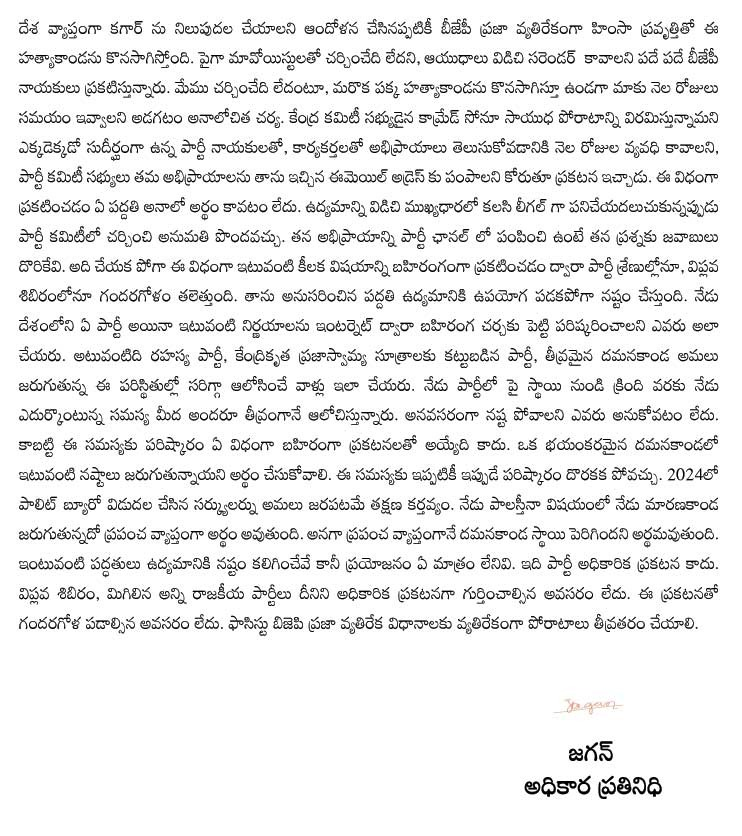 2024లో పాలిట్ బ్యూరో విడుదల చేసిన సర్క్యులర్ను అమలు జరపటమే తక్షణ కర్తవ్యం నేడు పాలస్తీనా విషయంలో నేడు మారణకాండ జరుగుతున్నదో ప్రపంచ వ్యాప్తంగా అర్ధం అవుతుంది. అనగా ప్రపంచ వ్యాప్తంగానే దమనకాండ స్థాయి పెరిగిందని అర్ధమవుతుంది. ఇంటువంటి పద్ధతులు ఉద్యమానికి నష్టం కలిగించేవే కానీ ప్రయోజనం ఏ మాత్రం లేనివి. ఇది పార్టీ అధికారిక ప్రకటన కాదు. విప్లవ శిబిరం. మిగిలిన అన్ని రాజకీయ పార్టీలు దీనిని అధికారిక ప్రకటనగా గుర్తించాల్సిన అవసరం లేదు. ఈ ప్రకటనతో గందరగోళ పడాల్సిన అవసరం లేదు. ఫాసిస్టు బీజేపీ ప్రజా వ్యతిరేక విధానాలకు వ్యతిరేకంగా పోరాటాలు తీవ్రతరం చేయాలి.