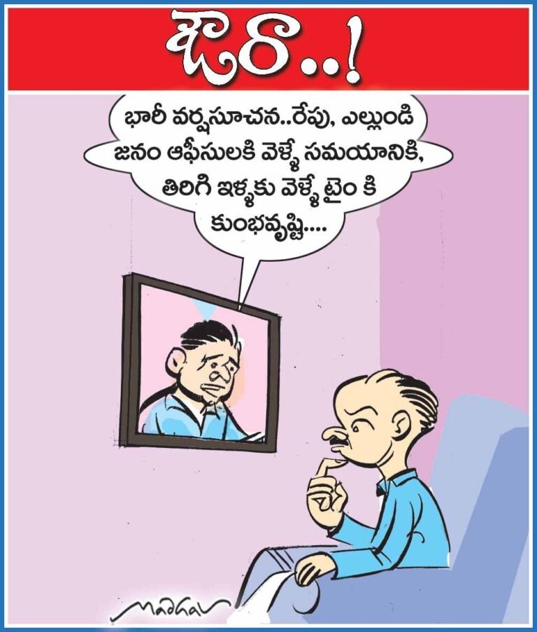 ఆంధ్రప్రభలో నేటి కార్టూన్ ఔరా 27-07-2025 July 27, 2025 heavy rain Telugu meme, Madhav cartoon, office timing satire, political cartoon India, rain alert joke, Telugu news humor, Telugu political cartoon, Telugu satirical cartoon