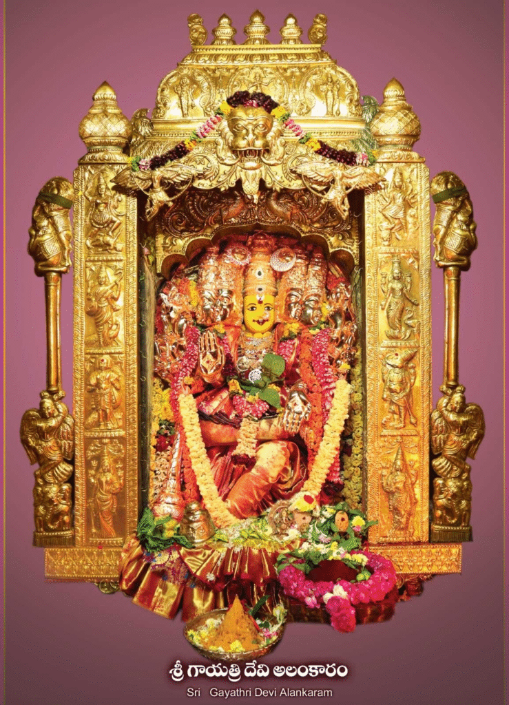 గాయత్రీం వరదాభయాంకుశాకశా పాశం కపాలం గదాం।