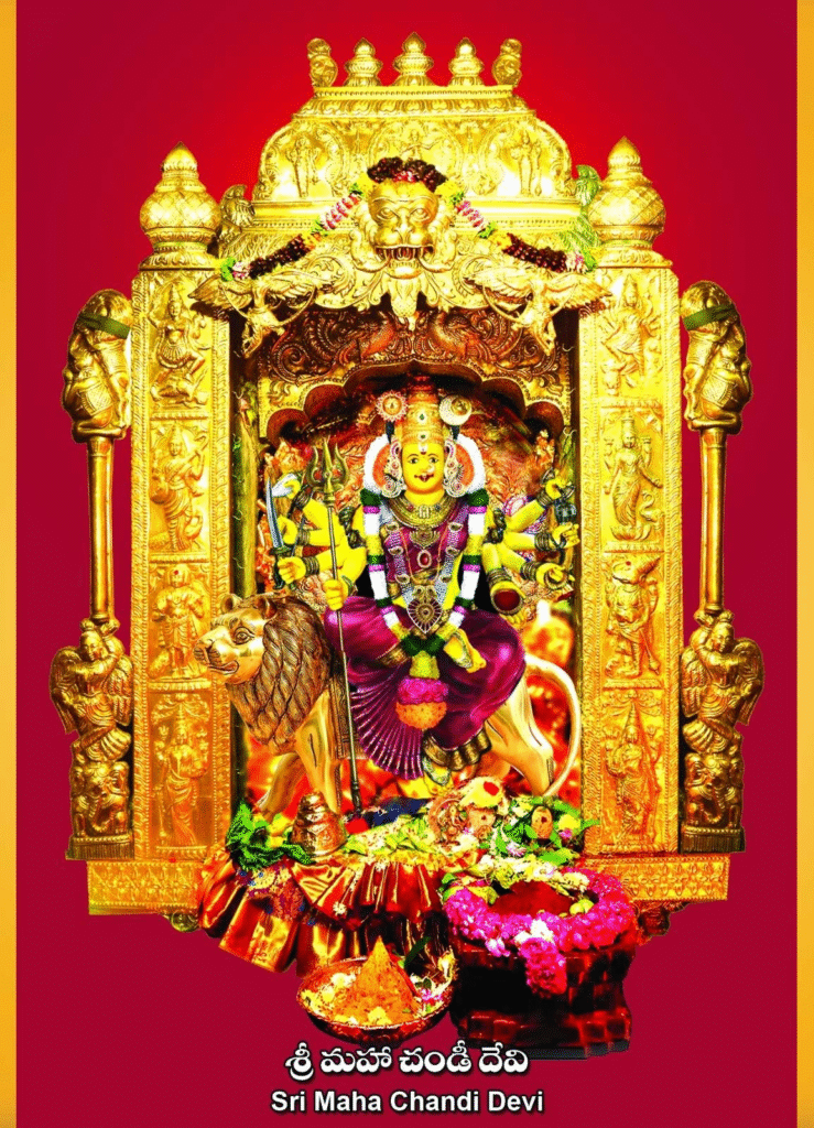ఈ దేవత అఘండమైన సర్వ శక్తి కలిగి మూడు కన్నుల దేవతగా చంద్రవంకతో అలంకరించబడింది. ఈమె బహుళ బాహువులు మంగళకరమైన ఆయుధాలు, చిహ్నాలు, ఆభరణాలు, పట్టు పీతాంబరాలు, పాత్రలు, మాలలు, జపమాలలు ధరించి ఉంటుంది. బంగారు రంగుతో వేయి సూర్యుల తేజస్సుతో ప్రకాశించే శరీరం, సింహవాహనంపై కూర్చున్న చండి విశ్వ శక్తి అన్ని స్వరూపాలలో అత్యంత అద్భుతమైనది.