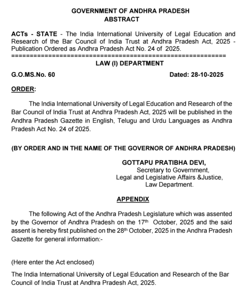 ఆంధ్రప్రదేశ్లో న్యాయ విద్యారంగంలో చారిత్రాత్మక పరిణామం చోటుచేసుకుంది. రాష్ట్ర ప్రభుత్వం అంతర్జాతీయ స్థాయిలో న్యాయవిద్యను అందించేందుకు ‘లీగల్ ఎడ్యుకేషన్ యూనివర్సిటీ’ని ఏర్పాటు చేయాలని నిర్ణయించింది. ‘ది ఇండియా ఇంటర్నేషనల్ యూనివర్సిటీ ఆఫ్ లీగల్ ఎడ్యుకేషన్ అండ్ రీసెర్చ్ ఎట్ ఆంధ్రప్రదేశ్ యాక్ట్, 2025’కు గవర్నర్ ఆమోదం తెలిపారు. దీంతో ఈ యూనివర్సిటీ ఏర్పాటు కు ప్రభుత్వం ఉత్తర్వులు జారీ చేసింది.