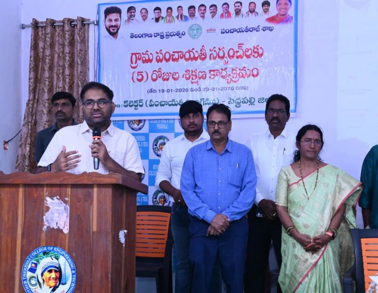 training | పెద్దపల్లి రూరల్, ఆంధ్రప్రభ : నూతనంగా ఎన్నికైన సర్పంచ్ లు గ్రామాలలో ఆదర్శవంతమైన పరిపాలన అందించాలని జిల్లా కలెక్టర్ కోయ శ్రీ హర్ష అన్నారు. ఈ రోజు పెద్దపల్లి మదర్ థెరిసా ఇంజనీరింగ్ కళాశాలలో నూతన సర్పంచ్‌లకు 5 రోజుల పాటు ఏర్పాటు చేసిన శిక్షణ కార్యక్రమంలో ఈ రోజు జిల్లా కలెక్టర్ కోయ శ్రీ హర్ష పాల్గొన్నారు. ఈ సందర్భంగా మాట్లాడుతూ.. గ్రామ పంచాయతీ ఎన్నికలలో గెలుపొందిన నూతన సర్పంచ్‌లకు, వార్డు సభ్యులకు కలెక్టర్ అభినందనలు తెలిపారు.