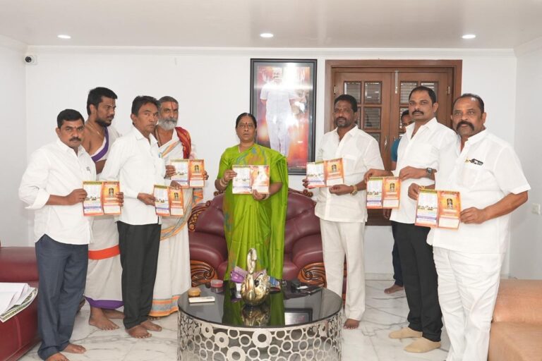 గీసుగొండ, ఆంధ్రప్రభ ; వరంగల్ జిల్లా గీసుగొండ మండలంలోని ప్రసిద్దిగాంచిన కొమ్మాల లక్ష్మినరససిహ్మ స్వామి జాతర సందర్భంగా దేవాదాయ శాఖ మంత్రివర్యులు కొండా సురేఖ ని మర్యాద పూర్వకంగా కలిసి జాతర వాల్ పోస్టర్లను మంత్రి చేతుల మీదుగా ఘనంగా ఆవిష్కరించడం జరిగింది. ఈ కార్యక్రమంలో సామాజిక సేవాకార్యకర్త అల్లం బాలకిషోర్ రెడ్డి, గీసుకొండ సర్పంచ్ వీరగోని రాజకుమార్, మాజీ పిఎసిఎస్ చైర్మన్ కక్కెర్ల శ్రీనివాస్, ఈ.ఓ. ప్రసాద్, అర్చకులు రామా ఆచార్యులు, విష్ణు తదితరులు పాల్గొన్నారు.
