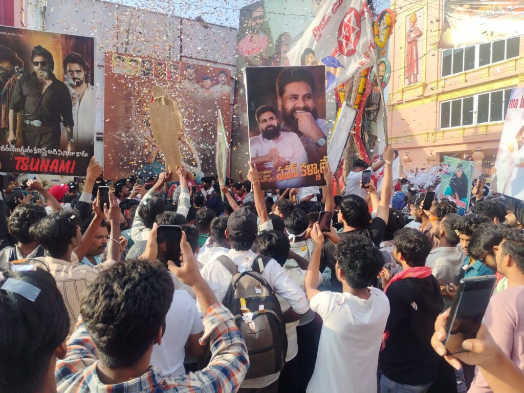 ఎన్టీఆర్ బ్యూరో, ఆంధ్రప్రభ : పవర్ స్టార్ పవన్ కళ్యాణ్ నటించిన వస్తాది భగత్ సింగ్ విడుదలతో విజయవాడ నగరంలో అభిమానుల ఉత్సాహానికి హద్దే లేదు. తెల్లవారుజామున నుంచే థియేటర్ల వద్దకు తరలివచ్చిన అభిమానులు భారీగా గుమిగూడి పండుగ వాతావరణాన్ని సృష్టించారు. భారీ కటౌట్లు, ఫ్లెక్సీలు, డీజే ధ్వనులతో నగర వీధులు కళకళలాడాయి. పవర్ స్టార్ పవన్ కళ్యాణ్ పట్ల అభిమానుల అభిమానావేశం అట్టడుగునుంచి ఉప్పొంగింది. పూలదండలు వేసి, పాలాభిషేకాలు నిర్వహిస్తూ అభిమానులు తమ ఆనందాన్ని వ్యక్తం చేశారు. ఫ్లెక్సీలకు కొబ్బరికాయలు కొట్టి ప్రత్యేక పూజలు చేయడం ప్రత్యేక ఆకర్షణగా నిలిచింది. మాస్ ఎంటర్టైన్మెంట్కు చిరునామాగా నిలిచిన దర్శకుడు హరీష్ శంకర్ ముద్ర ఈ చిత్రంలో స్పష్టంగా కనిపిస్తోందని అభిమానులు అభిప్రాయపడుతున్నారు.