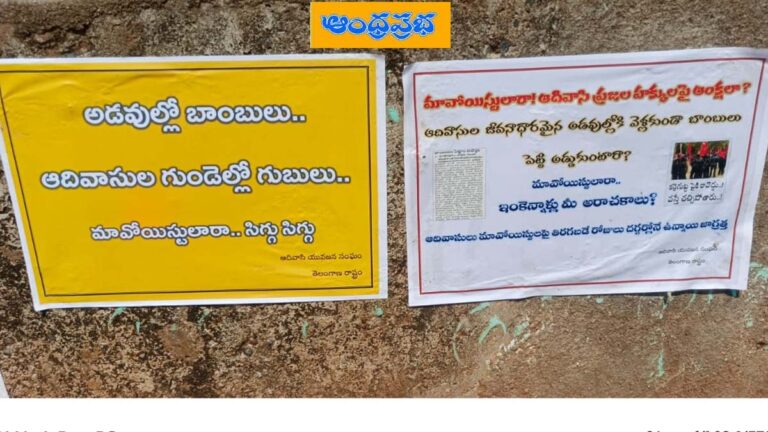 వాజేడు ఏప్రిల్ 14 ఆంధ్రప్రభ : మారుమూల ఏజెన్సీ ప్రాంతమైన ములుగు జిల్లా వాజేడు మండల వ్యాప్తంగా మావోయిస్టు పార్టీకి వ్యతిరేకంగా గిరిజన యువజన సంఘం పేరిట కరపత్రాలు వెలిశాయి. మండలంలోని పేరూరు పోలీస్ స్టేషన్ పరిధిలో గల టేకులగూడెం కృష్ణాపురం కడేకల్ పేరూరు అదేవిధంగా వాజేడు పోలీస్ స్టేషన్ పరిధిలోని కొప్పుసురు మురుమూరు ప్రగల్లపల్లి ప్రాంతంలో సోమవారం కరపత్రాలు వెలువడటంతో బయానక వాతావరణం ఏర్పడింది.