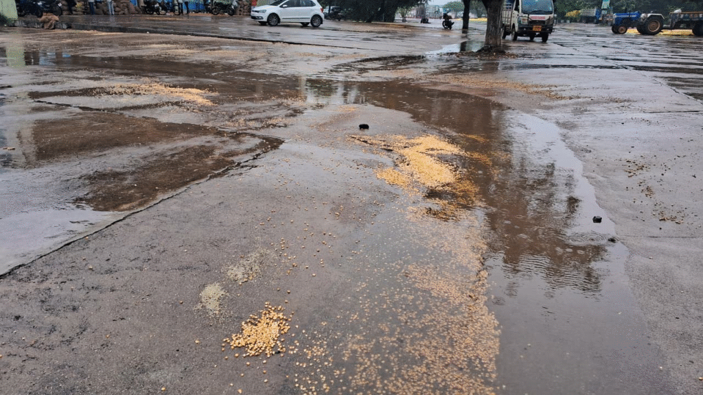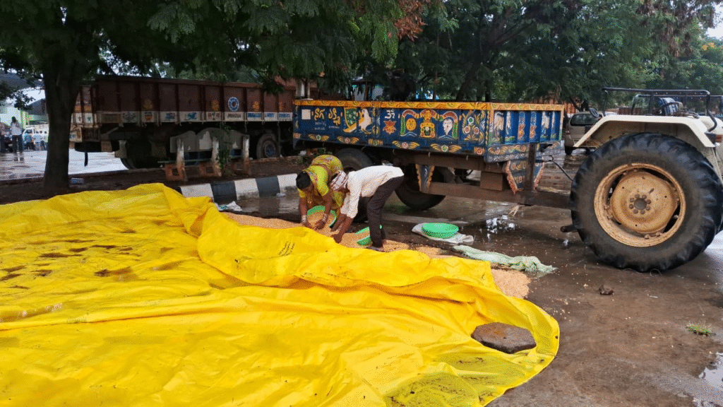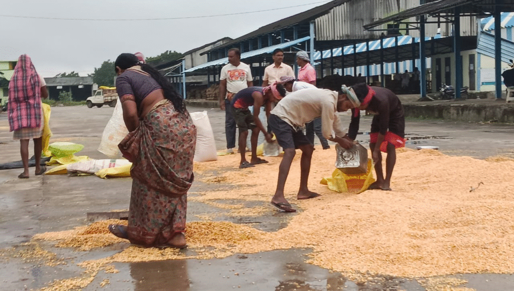 మక్క ధాన్యంలో ఉన్న తేమ ఆరి పోవడం కోసమై మార్కెట్ షేడ్స్ పక్కన గల ఆరుబయట ఆరబోశారు. ఒకేసారి వర్షం ప్రారంభమై ఎడతెరిపి లేకుండా కురుస్తుండడంతో వర్షానికి మక్కలు తడిసి పోవడంతో ఖరీదుదారులు కొనుగోళ్ళు(purchases) చేయడానికి ఆసక్తి చూపడం లేదు. వర్షం కారణంగా ఆరుగాలం శ్రమించిన తమకు ఆర్ధిక నష్టం వస్తోందని రైతులు వాపోతున్నారు