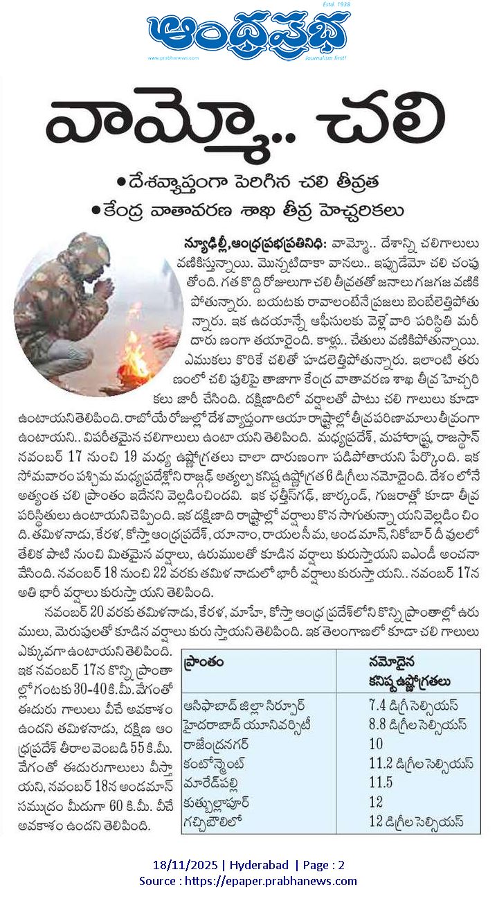 మధ్యప్రదేశ్, మహారాష్ట్ర, రాజస్థాన్ నవంబర్ 17 నుంచి 19 మధ్య ఉష్ణోగ్రతలు చాలా దారుణంగా పడిపోతాయని పేర్కొంది. ఇక సోమవారం పశ్చిమ మధ్యప్రదేశ్లోని రాజఢ్ అత్యల్ప కనిష్ట ఉష్ణోగ్రత 6 డిగ్రీలు నమోదైంది. దేశంలోనే అత్యంత చలి ప్రాంతం ఇదేనని వెల్లడించిందవి. ఇక ఛత్తీస్గఢ్, జార్కండ్, గుజరాత్లో కూడా తీవ్ర పరిస్థితులు ఉంటాయని చెప్పింది. ఇక దక్షిణాది రాష్ట్రాల్లో వర్షాలు కొన సాగుతున్నాయని వెల్లడించింది. తమిళనాడు, కేరళ, కోస్తా ఆంధ్రప్రదేశ్, (Andhra pradesh) యానాం, రాయలసీమ, అండమాన్, నికోబార్ దీవులలో తేలిక పాటి నుంచి మితమైన వర్షాలు, ఉరుములతో కూడిన వర్షాలు కురుస్తాయని ఐఎండీ అంచనా వేసింది. నవంబర్ 18 నుంచి 22 వరకు తమిళ నాడులో భారీ వర్షాలు కురుస్తా యని.. నవంబర్ 17న అతి భారీ వర్షాలు కురుస్తాయని తెలిపింది.