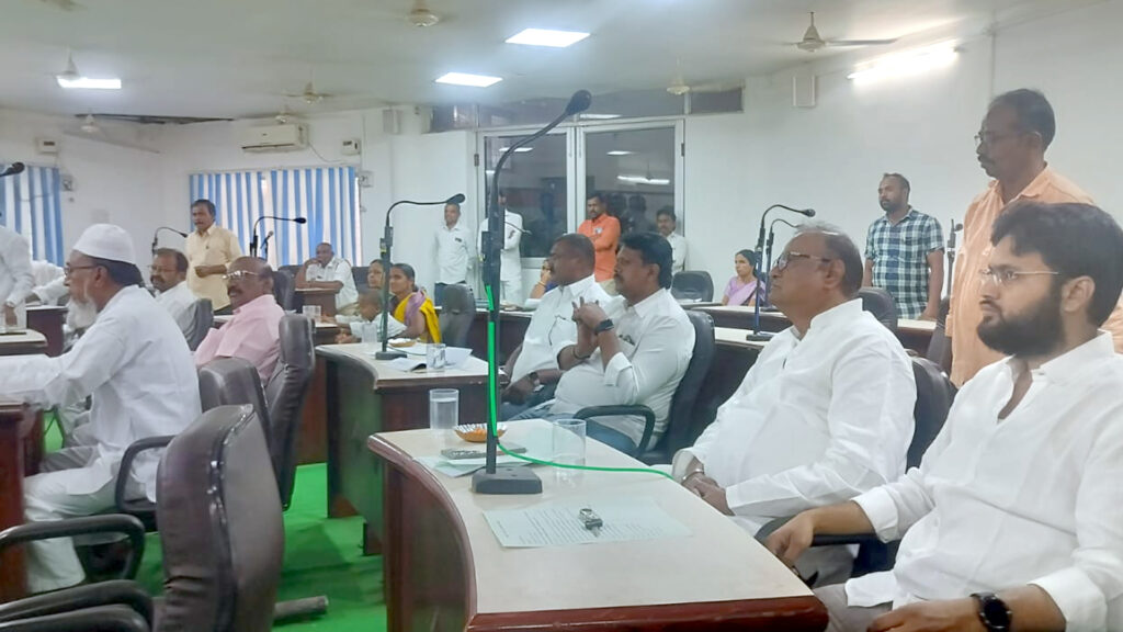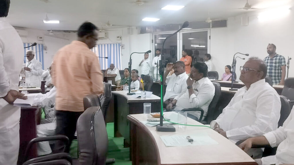 - సమావేశంలో ఆలయ ప్లకార్డులు పట్టుకొని నిరసనకు కూర్చున్న కౌన్సిలర్లు..